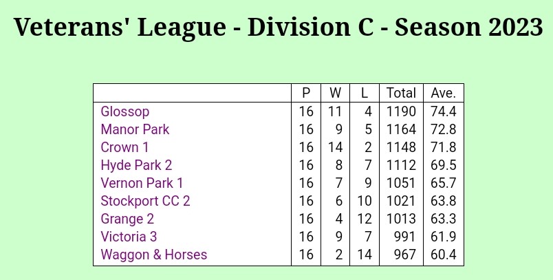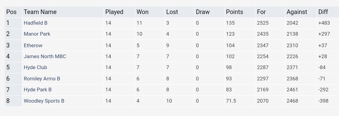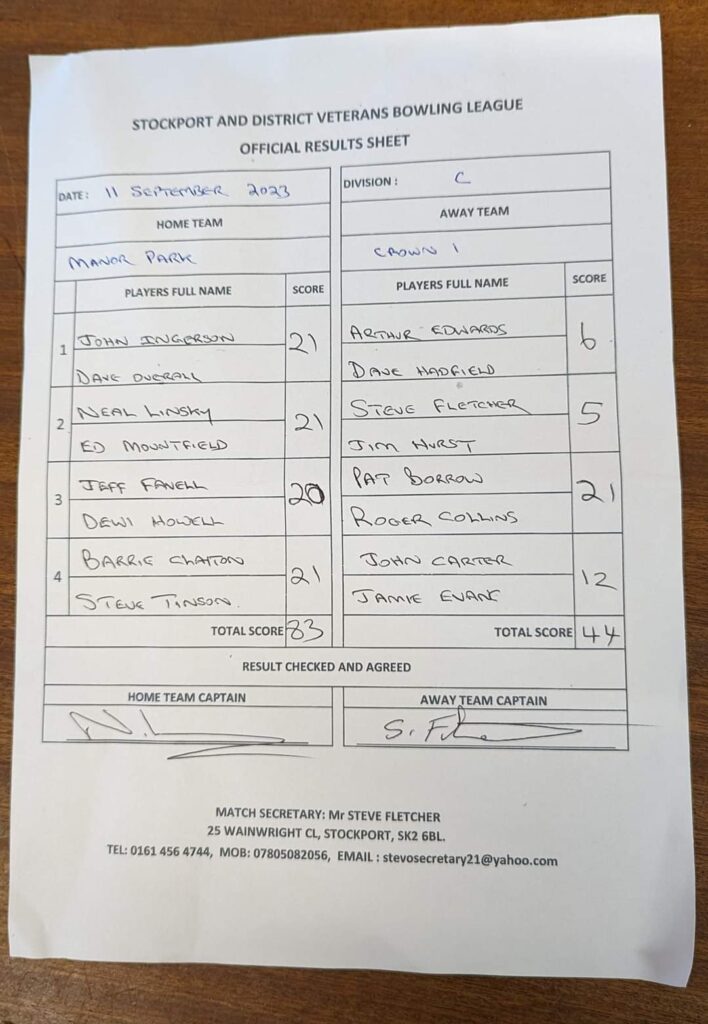 Well done to the Stockport Vets team who secured promotion to Division B for next season by beating Crown 1 by 83 – 44 points.