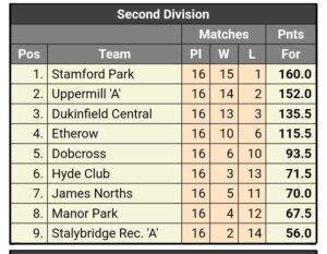Our Saturday Longdendale team are celebrating promotion to Division 2 after the final two games of the season put them in second place of Division 3.  Well done to the team and especially our Captain Luke Jones.