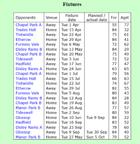 Fixtures 2025: (Home matches commence at 6.15 April, August and September and 7 pm May, June and July)
